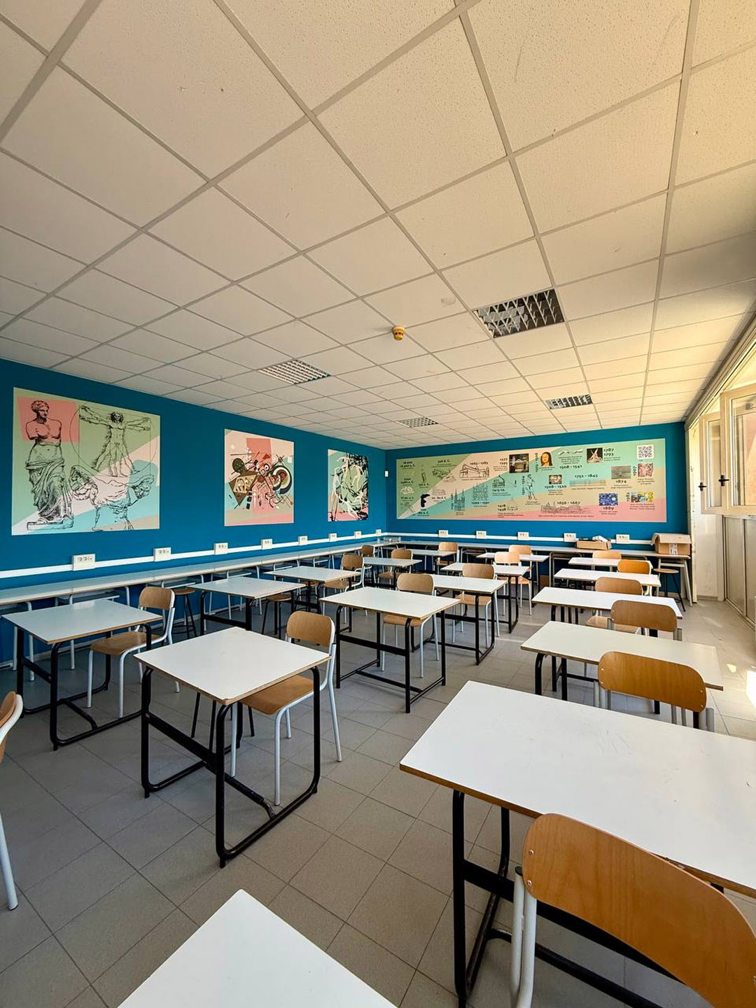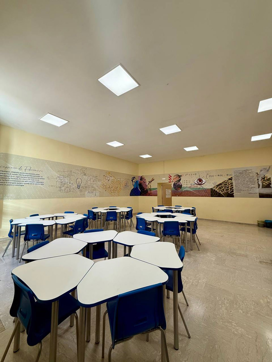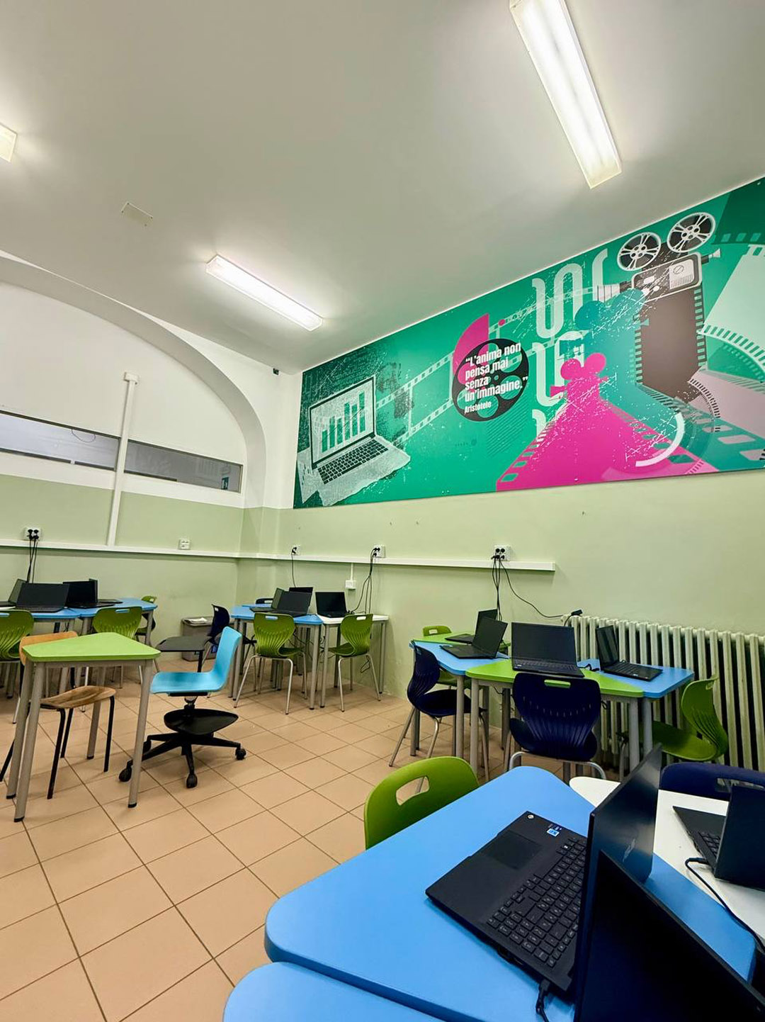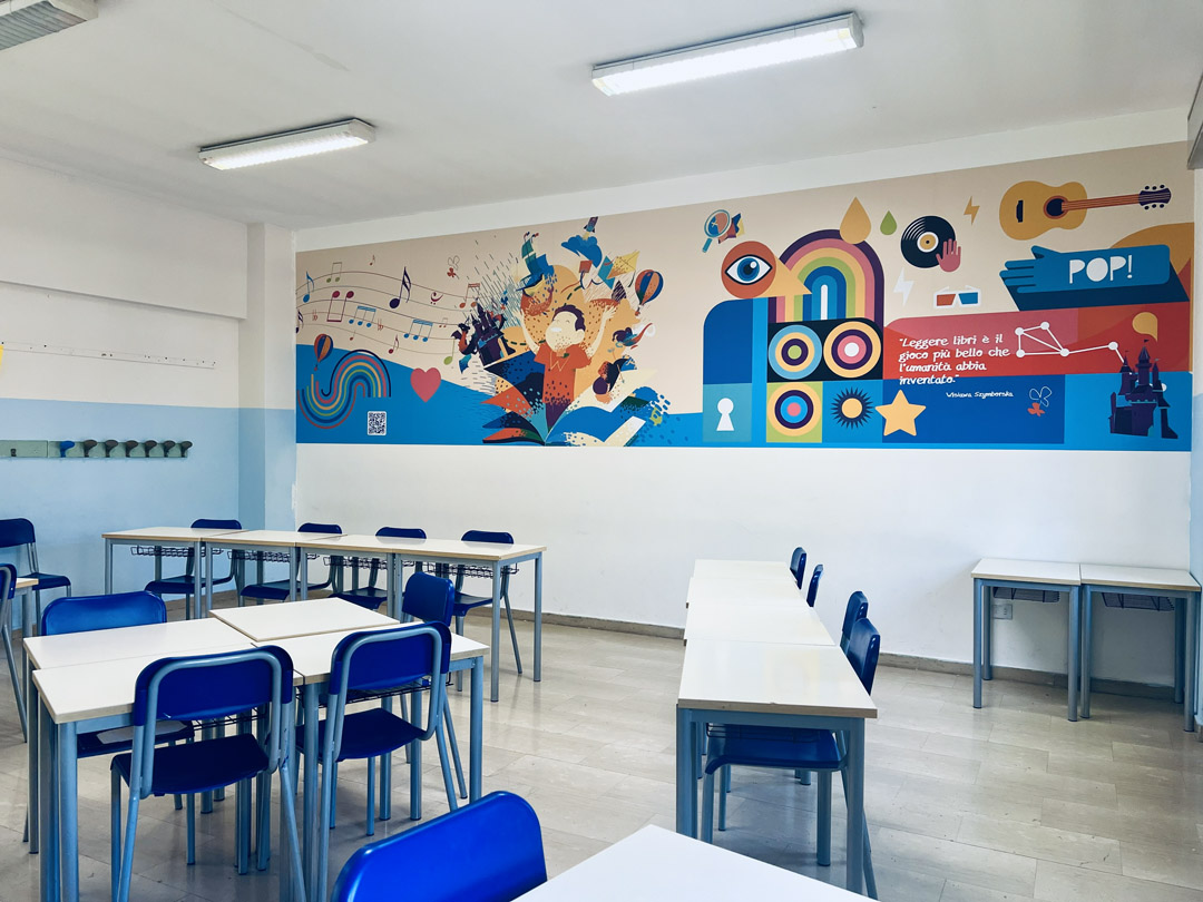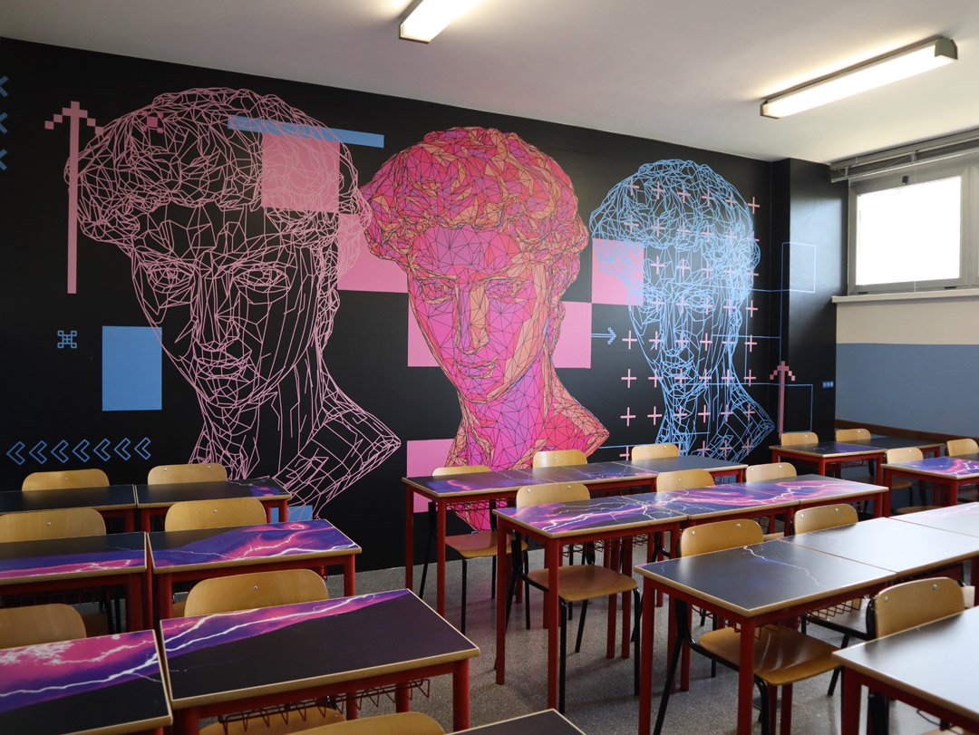 Dalle decorazioni murarie alle soluzioni per pavimenti, dalla segnaletica direzionale alle tecnologie interattive (HyperWall!), abbiamo costruito ambienti scolastici coinvolgenti, funzionali e sostenibili.